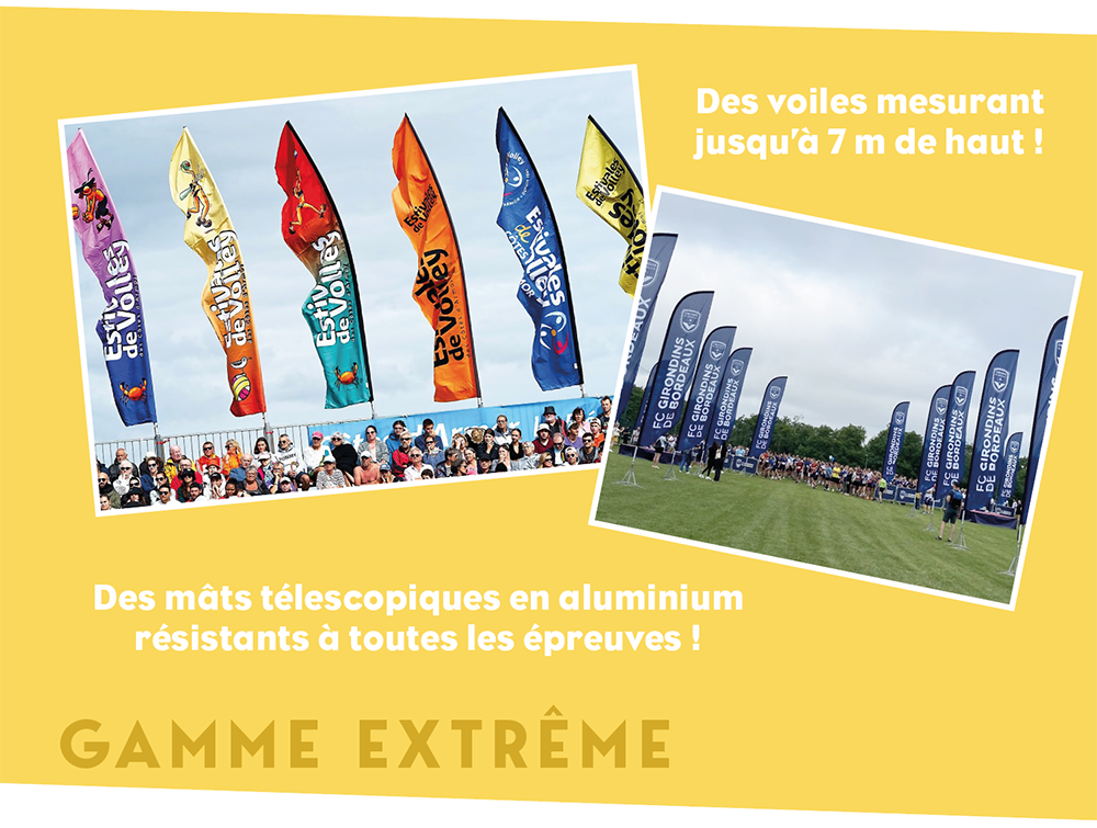 Chez CAP nous voulons porter votre image haut et fort, c'est dans ce sens que nous avons développé nos différentes gammes d'oriflammes. Que ce soit pour un usage en intérieur, comme en extérieur, nous avons la voile, le mât et le socle qui saura répondre à vos besoins.