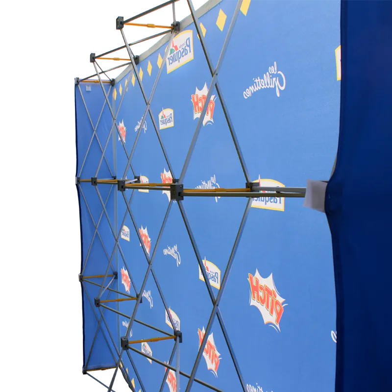 Le fond de stand pliable, aussi appelé stand parapluie est un support de communication horizontal pouvant être imprimé sur différents textiles, en sérigraphie, en impression numérique ou par sublimation et offrant une grande surface de communication, idéal pour apposer les logos de vos partenaires lors d’interviews ou de séances de photographies. La structure en aluminium du fond de stand pliable est légère et rétractable. Son profilé hexagonal lui confère une solidité et une résistance aux conditions climatiques. Le visuel de ce produit peut être uniquement sur la face avant, avec un retour sur les côtés, ou encore en Recto Verso. La hauteur du fond de stand pliable sera de 225 cm, et sa largeur pourra varier, par incréments de 75 cm. Ce support de communication sera disponible en format classique droit, ou en version courbe.