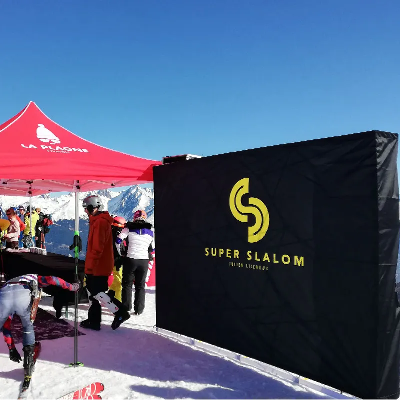 Le fond de stand pliable, aussi appelé stand parapluie est un support de communication horizontal, idéal pour apposer les logos de vos partenaires lors d’interviews ou de séances de photographies.