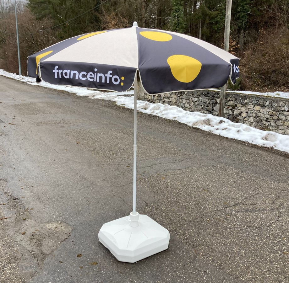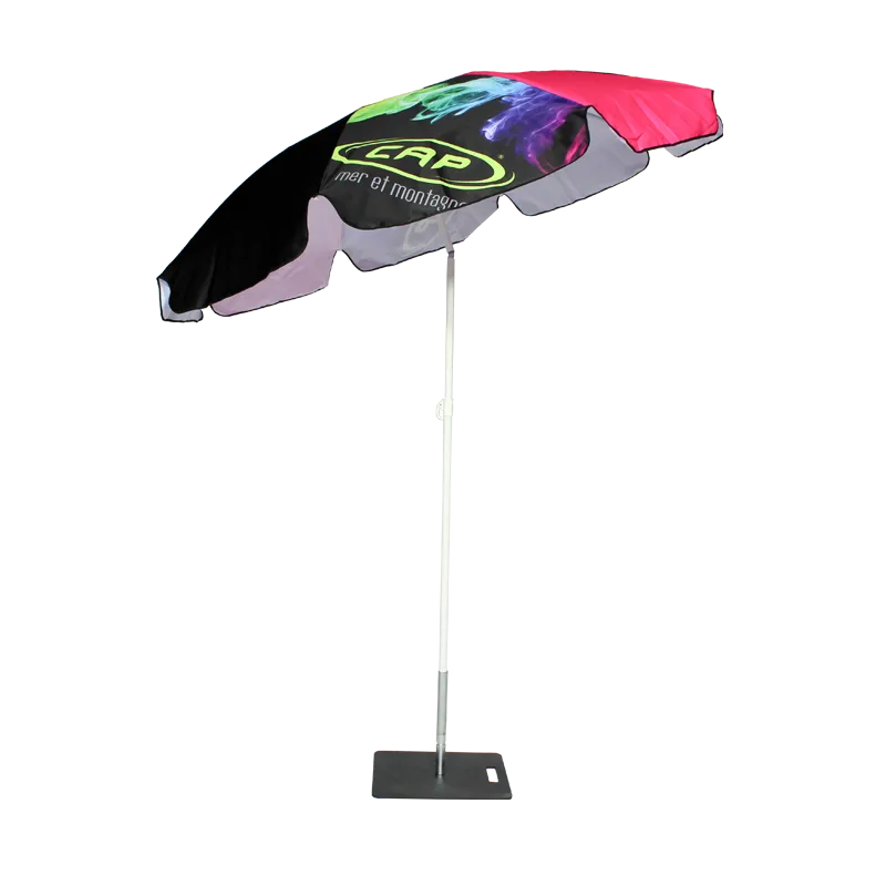 Le parasol est un outil de promotion offrant une protection efficace contre le soleil. Celle-ci peut être imprimée tant sur la face extérieure qu’intérieure.